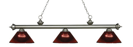 Elegant and traditional best describes this beautiful three light fixture. Finished in Antique Silver and paired with Burgundy Acrylic shades, this three light fixture would be equally at home in the game room, or anywhere else in the house needing a touch of timeless charm.