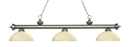 Elegant and traditional best describes this beautiful three light fixture. Finished in Antique Silver and paired with Dome Golden Mottle glass shades, this three light fixture would be equally at home in the game room, or anywhere else in the house needing a touch of timeless charm.
