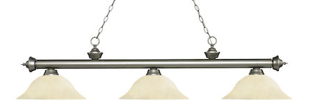 Elegant and traditional best describes this beautiful three light fixture. Finished in Antique Silver and paired with Golden Mottle glass shades, this three light fixture would be equally at home in the game room, or anywhere else in the house needing a touch of timeless charm.