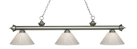 Elegant and traditional best describes this beautiful three light fixture. Finished in Antique Silver and paired with White Plastic shades, this three light fixture would be equally at home in the game room, or anywhere else in the house needing a touch of timeless charm.
