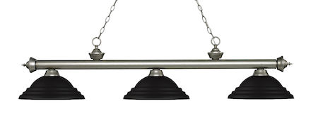 Elegant and traditional best describes this beautiful three light fixture. Finished in Antique Silver and paired with Stepped Matte Black Metal shades, this three light fixture would be equally at home in the game room, or anywhere else in the house needing a touch of timeless charm.
