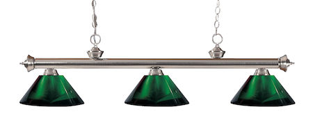 Finished in brushed nickel this three light bar fixture uses acrylic green shades to create a contemporary look with a timeless quality to it. This fixture would be perfect for the game room, or any other room of the house where a touch of under stated sophistication is needed.
