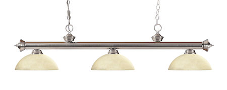 Elegant and traditional best describes this beautiful three light fixture. Finished in brushed nickel and paired with dome golden mottle glass shades, this three light fixture would be equally at home in the game room, or anywhere else in the house needing a touch of timeless charm.