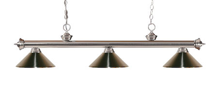 Elegant and traditional best describes this beautiful three light fixture. Finished in brushed nickel and paired with metal brushed nickel shades, this three light fixture would be equally at home in the game room, or anywhere else in the house needing a touch of timeless charm