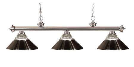 Elegant and traditional best describes this beautiful three light fixture. Finished in brushed nickel and paired with clear ribbed glass + brushed nickel shades, this three light fixture would be equally at home in the game room, or anywhere else in the house needing a touch of timeless charm. 72 inches of chain per side is included to ensure a perfect hanging height.