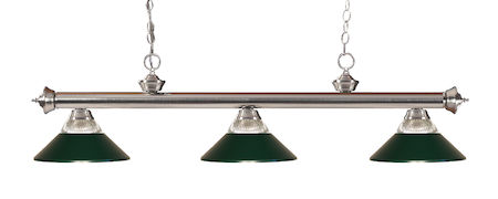 The simple styling of this three light fixture creates a classic statement. Finished in brushed nickel, this three light fixture uses half dark green metal, half clear ribbed glass shades to compliment its classic look.