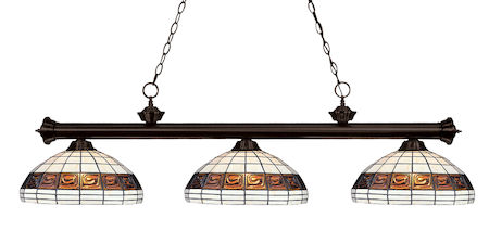 Elegant and traditional best describes this beautiful three light fixture. Finished in oil rubbed bronze and paired with decorative tiffany glass shades, this three light fixture would be equally at home in the game room, or anywhere else in the house needing a touch of timeless charm. 72 inches of chain per side is included to ensure a perfect hanging height.