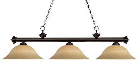 Elegant and traditional best describes this beautiful three light fixture. Finished in oil rubbed bronze and paired with golden mottle shades, this three light fixture would be equally at home in the game room, or anywhere else in the house needing a touch of timeless charm. 72 inches of chain per side is included to ensure a perfect hanging height.