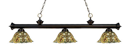 Traditional charm defines this three light fixture. The bar is finished in bronze, and is paired beautifully with three multi colored tiffany shades for an inviting glow.