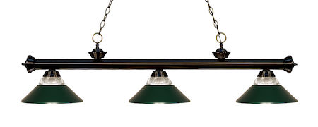 The simple styling of this three light fixture creates a classic statement. Finished in bronze, this three light fixture uses half dark green metal, half clear ribbed glass shades to compliment its classic look.