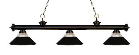The simple styling of this three light fixture creates a classic statement. Finished in bronze, this three light fixture uses half matte black metal, half clear ribbed glass shades to compliment its classic look.