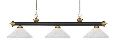 Elegant and traditional best describes this beautiful three light fixture. Finished in oil rubbed Bronze & Satin Gold and paired with angle white linen glass shades, this three light fixture would be equally at home in the game room, or anywhere else in the house needing a touch of timeless charm. 72 inches of chain per side is included to ensure a perfect hanging height.
