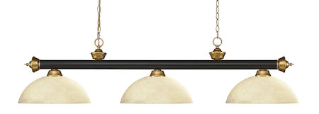 Elegant and traditional best describes this beautiful three light fixture. Finished in oil rubbed Bronze & Satin Gold and paired with golden mottle glass shades, this three light fixture would be equally at home in the game room, or anywhere else in the house needing a touch of timeless charm. 72 inches of chain per side is included to ensure a perfect hanging height.