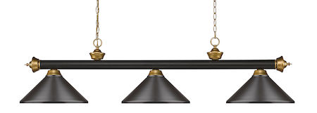 Elegant and traditional best describes this beautiful three light fixture. Finished in oil rubbed Bronze & Satin Gold and paired with metal Bronze shades, this three light fixture would be equally at home in the game room, or anywhere else in the house needing a touch of timeless charm. 72 inches of chain per side is included to ensure a perfect hanging height.