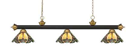 Traditional charm defines this three light fixture. The bar is finished in Bronze & Satin Gold, and is paired beautifully with three multi colored tiffany shades for an inviting glow.