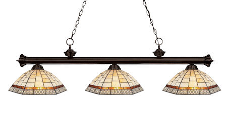 Elegant and traditional best describes this beautiful three light fixture. Finished in oil rubbed bronze and paired with decorative tiffany glass shades, this three light fixture would be equally at home in the game room, or anywhere else in the house needing a touch of timeless charm. 72 inches of chain per side is included to ensure a perfect hanging height.