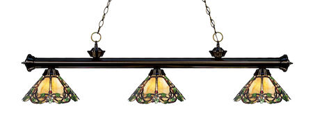 Traditional charm defines this three light fixture. The bar is finished in bronze, and is paired beautifully with three multi colored tiffany shades for an inviting glow.