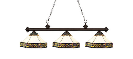 Elegant and traditional best describes this beautiful three light fixture. Finished in oil rubbed bronze and paired with decorative tiffany glass shades, this three light fixture would be equally at home in the game room, or anywhere else in the house needing a touch of timeless charm. 72 inches of chain per side is included to ensure a perfect hanging height.