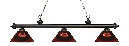 Elegant and traditional best describes this beautiful three light fixture. Finished in Golden Bronze and paired with Burgundy Acrylic shades, this three light fixture would be equally at home in the game room, or anywhere else in the house needing a touch of timeless charm.