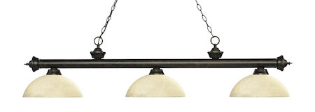 Elegant and traditional best describes this beautiful three light fixture. Finished in Golden Bronze and paired with Dome Golden Mottle glass shades, this three light fixture would be equally at home in the game room, or anywhere else in the house needing a touch of timeless charm.