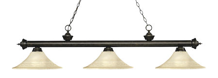Elegant and traditional best describes this beautiful three light fixture. Finished in Golden Bronze and paired with Fluted Golden Mottle glass shades, this three light fixture would be equally at home in the game room, or anywhere else in the house needing a touch of timeless charm.