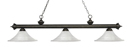 Elegant and traditional best describes this beautiful three light fixture. Finished in Golden Bronze and paired with Fluted White Mottle glass shades, this three light fixture would be equally at home in the game room, or anywhere else in the house needing a touch of timeless charm.