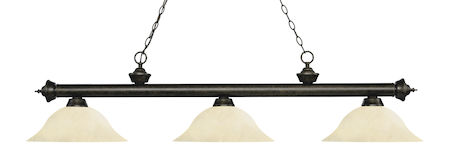 Elegant and traditional best describes this beautiful three light fixture. Finished in Golden Bronze and paired with Golden Mottle glass shades, this three light fixture would be equally at home in the game room, or anywhere else in the house needing a touch of timeless charm.