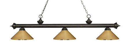 Elegant and traditional best describes this beautiful three light fixture. Finished in Golden Bronze and paired with Polished Brass Metal shades, this three light fixture would be equally at home in the game room, or anywhere else in the house needing a touch of timeless charm.