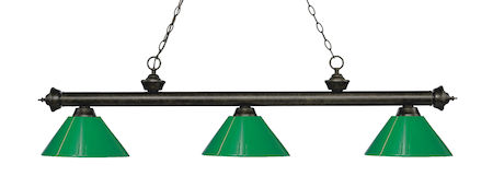 Elegant and traditional best describes this beautiful three light fixture. Finished in Golden Bronze and paired with Green Plastic shades, this three light fixture would be equally at home in the game room, or anywhere else in the house needing a touch of timeless charm.