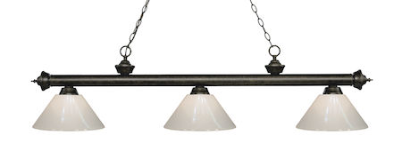 Elegant and traditional best describes this beautiful three light fixture. Finished in Golden Bronze and paired with White Plastic shades, this three light fixture would be equally at home in the game room, or anywhere else in the house needing a touch of timeless charm.