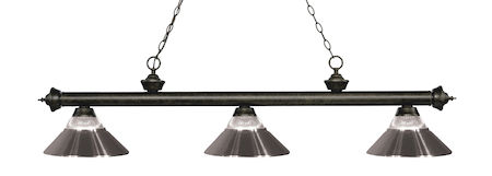 Elegant and traditional best describes this beautiful three light fixture. Finished in Golden Bronze and paired with Clear Ribbed Glass and Brushed Nickel Metal shades, this three light fixture would be equally at home in the game room, or anywhere else in the house needing a touch of timeless charm.