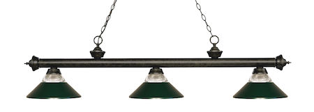 Elegant and traditional best describes this beautiful three light fixture. Finished in Golden Bronze and paired with Clear Ribbed Glass and Dark Green shades, this three light fixture would be equally at home in the game room, or anywhere else in the house needing a touch of timeless charm.