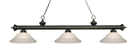 Elegant and traditional best describes this beautiful three light fixture. Finished in Golden Bronze and paired with White Swirl glass shades, this three light fixture would be equally at home in the game room, or anywhere else in the house needing a touch of timeless charm.