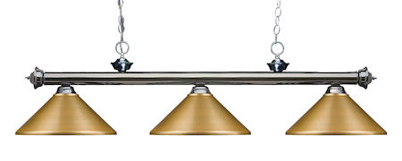 Elegant and traditional best describes this beautiful three light fixture. Finished in gun metal and paired with metal satin gold shades, this three light fixture would be equally at home in the game room, or anywhere else in the house needing a touch of timeless charm