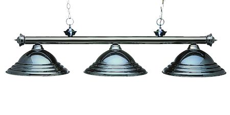 Elegant and traditional best describes this beautiful three light fixture. Finished in gun metal and paired with stepped gun metal shades, this three light fixture would be equally at home in the game room, or anywhere else in the house needing a touch of timeless charm. 72 inches of chain per side is included to ensure a perfect hanging height.