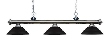 Elegant and traditional best describes this beautiful three light fixture. Finished in gun metal and paired with metal stepped matte black shades, this three light fixture would be equally at home in the game room, or anywhere else in the house needing a touch of timeless charm