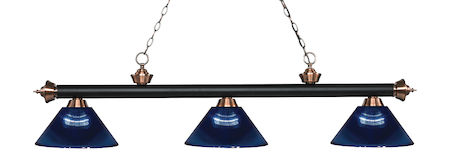 Elegant and traditional best describes this beautiful three light fixture. Finished in Matte Black + Antique Copper and paired with Dark Blue Acrylic shades, this three light fixture would be equally at home in the game room, or anywhere else in the house needing a touch of timeless charm.