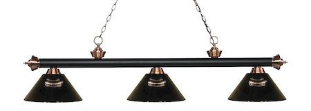 Elegant and traditional best describes this beautiful three light fixture. Finished in Matte Black + Antique Copper and paired with Green Acrylic shades, this three light fixture would be equally at home in the game room, or anywhere else in the house needing a touch of timeless charm.