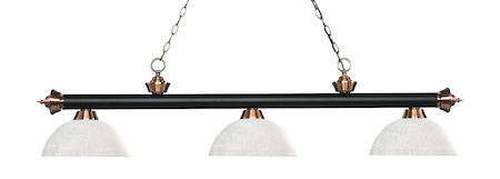 Elegant and traditional best describes this beautiful three light fixture. Finished in Matte Black + Antique Copper and paired with Dome White Linen glass shades, this three light fixture would be equally at home in the game room, or anywhere else in the house needing a touch of timeless charm.