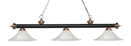 Elegant and traditional best describes this beautiful three light fixture. Finished in Matte Black + Antique Copper and paired with Fluted White Mottle glass shades, this three light fixture would be equally at home in the game room, or anywhere else in the house needing a touch of timeless charm.