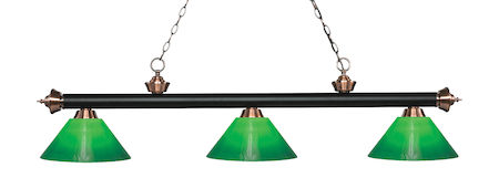 Elegant and traditional best describes this beautiful three light fixture. Finished in Matte Black + Antique Copper and paired with Green Cased glass shades, this three light fixture would be equally at home in the game room, or anywhere else in the house needing a touch of timeless charm.