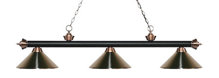 Elegant and traditional best describes this beautiful three light fixture. Finished in Matte Black + Antique Copper and paired with Brushed Nickel metal shades, this three light fixture would be equally at home in the game room, or anywhere else in the house needing a touch of timeless charm.
