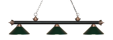 Elegant and traditional best describes this beautiful three light fixture. Finished in Matte Black + Antique Copper and paired with Dark Green Acrylic shades, this three light fixture would be equally at home in the game room, or anywhere else in the house needing a touch of timeless charm.