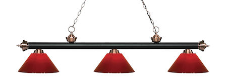Elegant and traditional best describes this beautiful three light fixture. Finished in Matte Black + Antique Copper and paired with Red Plastic shades, this three light fixture would be equally at home in the game room, or anywhere else in the house needing a touch of timeless charm.