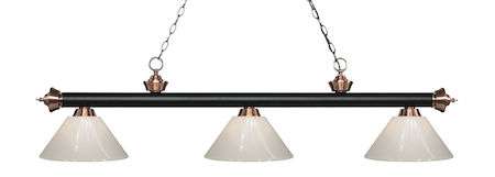 Elegant and traditional best describes this beautiful three light fixture. Finished in Matte Black + Antique Copper and paired with White Plastic shades, this three light fixture would be equally at home in the game room, or anywhere else in the house needing a touch of timeless charm.