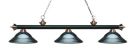Elegant and traditional best describes this beautiful three light fixture. Finished in Matte Black + Antique Copper and paired with Stepped Gun Metal Metal shades, this three light fixture would be equally at home in the game room, or anywhere else in the house needing a touch of timeless charm.