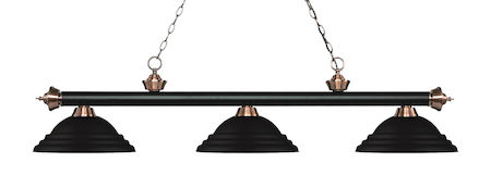 Elegant and traditional best describes this beautiful three light fixture. Finished in Matte Black + Antique Copper and paired with Stepped Matte Black Metal shades, this three light fixture would be equally at home in the game room, or anywhere else in the house needing a touch of timeless charm.
