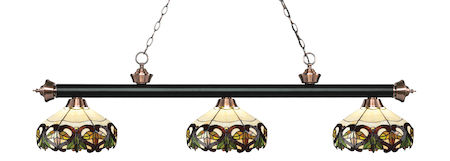 Traditional charm defines this three light fixture. The bar is finished in Matte Black and Antique Copper and is paired beautifully with three multi colored tiffany shades for an inviting glow. This fixture would be equally at home in the game room, or anywhere else in your home needing a touch of timeless charm.