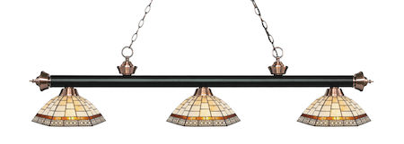 Traditional charm defines this three light fixture. The bar is finished in Matte Black and Antique Copper and is paired beautifully with three multi colored tiffany shades for an inviting glow. This fixture would be equally at home in the game room, or anywhere else in your home needing a touch of timeless charm.