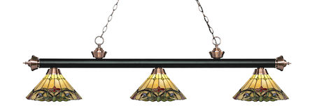 Traditional charm defines this three light fixture. The bar is finished in Matte Black and Antique Copper and is paired beautifully with three multi colored tiffany shades for an inviting glow. This fixture would be equally at home in the game room, or anywhere else in your home needing a touch of timeless charm.